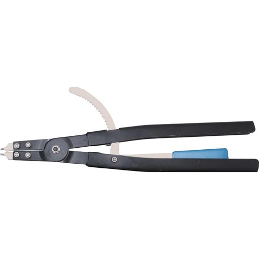 Belső Seeger-biztosítógyűrűk ki- és beszereléséhez. Racsnis kivitel, fekete porbevonatos, horganyzott hegyekkel, acéllemezből készült, rögzíthető markolat.