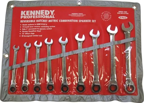 Racsnis csillag-villáskulcs készlet. Finomfogazású 72 fogas racsnival szerelve, ennek köszönhetően szűk helyeken is jól használható.Tartalmaz 1-1 db 10,11,12,13,14,15,16,17,19 mm-es kulcsot. Króm - Vanádium acélból készült tükörfény pilirozással, mely nem engedi a kulcshoz tapadni a szennyeződéseket. A racsnis fejbe süllyesztett irányváltó kar segítségével könnyű és gyors az irányváltás.